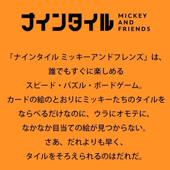 「ナインタイル ミッキーアンドフレンズ」は、誰でもすぐに楽しめるスピード・パズル・ボードゲーム。カードの絵のとおりにミッキーたちのタイルをならべるだけなのに、ウラにオモテに、なかなか目当ての絵が見つからない。さあ、だれよりも早く、タイルをそろえられるのはだれだ。友だちや家ぞくでの楽しみにも知育にも、とてもオススメのゲームです。 (※この商品は日本国内にのみ販売可能です。海外に輸出することは認められておりません。)