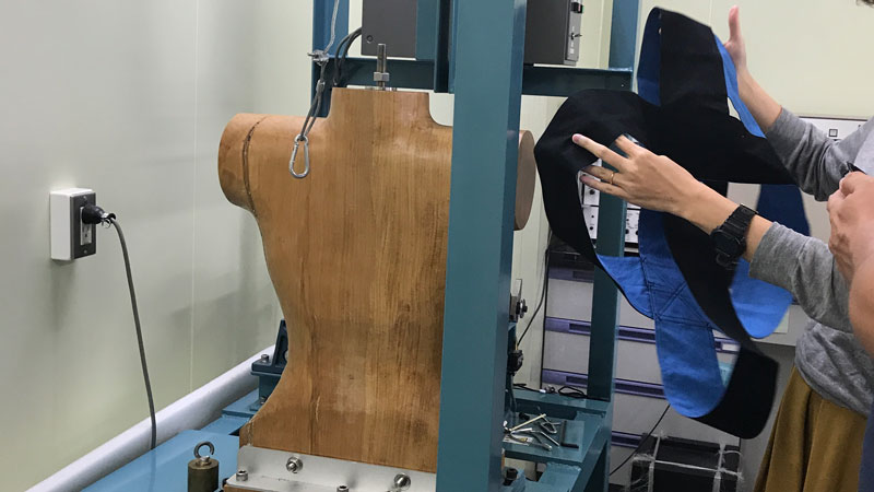 想定される体重をかけた状態で、縫製やバックル、ベルト部分が破損しないかを確認します。一定時間荷重をかけ続ける耐久試験も含まれます。